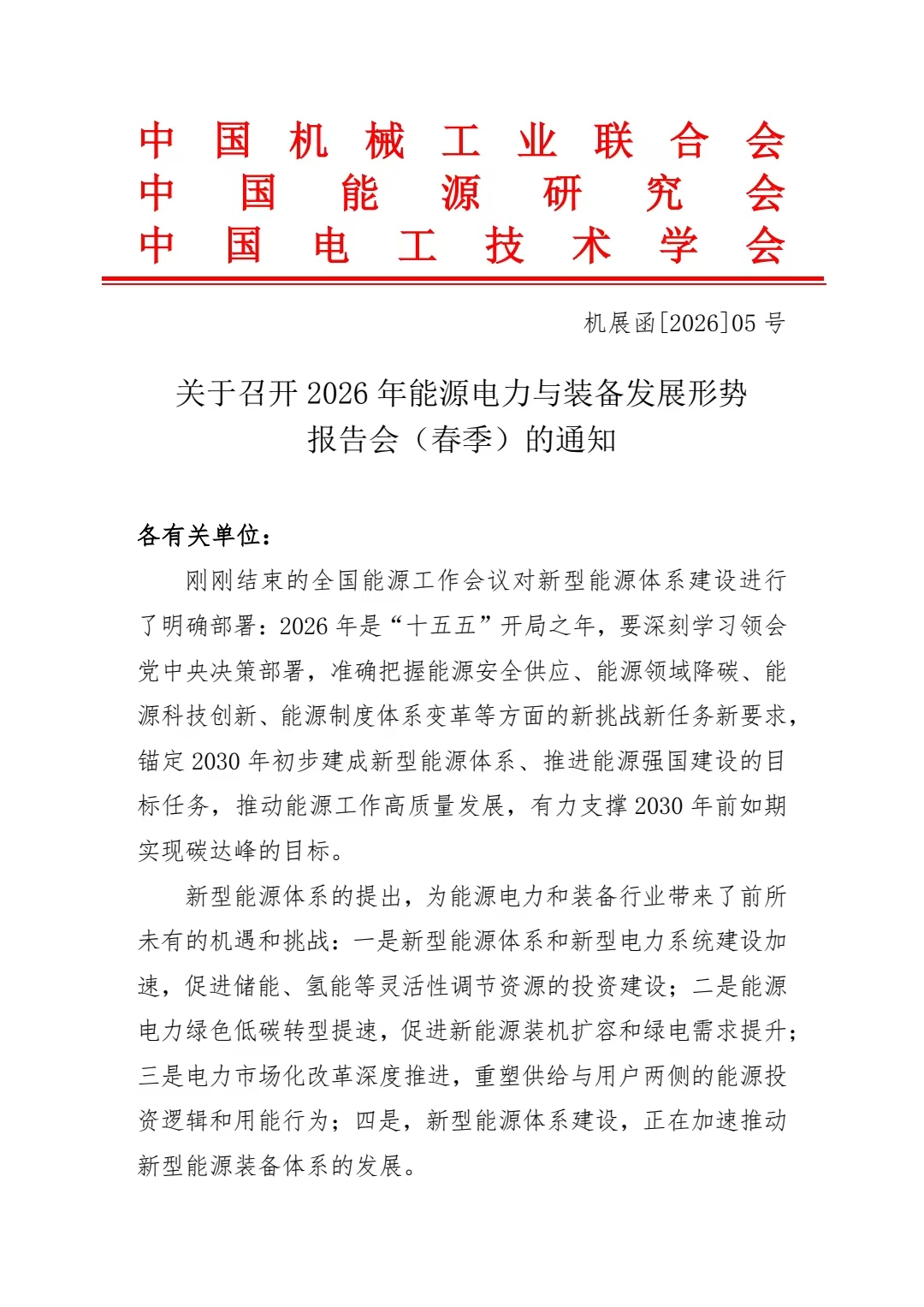 关于召开2026年能源电力与装备发展形势 报告会(春季)的通知